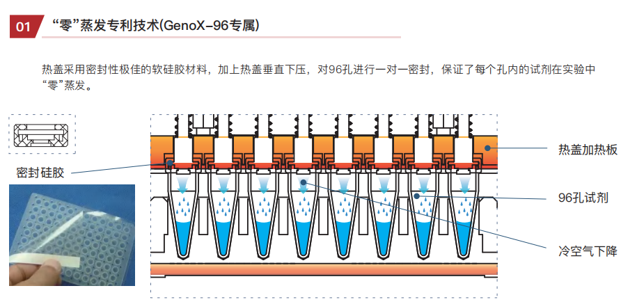 4.热盖采用密封性极佳的硅胶材料,加上热盖垂直下压,保 证了每个孔内的试剂在实验中“零”蒸发