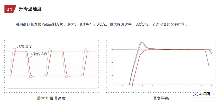 1.采用高效长寿命Peltier制冷片,最大升温速率:7.0℃/s, 最大降温速率:6.0℃/s,节约宝贵的实验时间