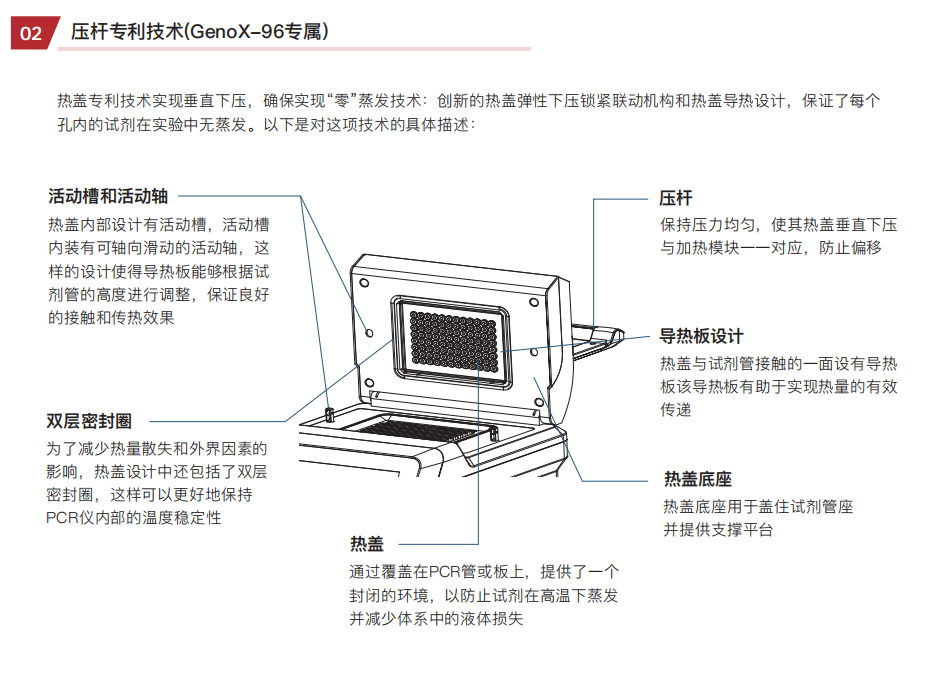 2.公司特有的创新压杆式热盖组件专利技术,弹性下压锁紧 联动机构,和热盖导热设计,保证了每个孔内的试剂在实 验中“零”蒸发
